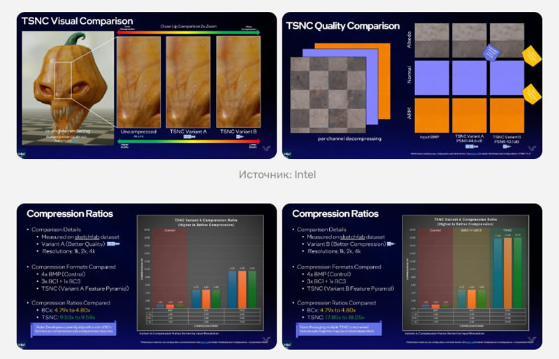 Разработчикам предложат два варианта использования алгоритма: вариант А и вариант B. Первый обеспечивает сжатие более чем в 9 раз при сохранении высокого качества изображения, тогда как второй ужимает файлы в 18 раз, но с более заметными визуальными потерями (например, артефактами в картах нормалей). В основе метода лежит обучение нейросети кодировать и декодировать набор текстур совместно, обходя ограничения стандартного блочного сжатия. При визуальной оценке Intel отметила потерю качества восприятия около 5 % для первого режима и 6–7 % для второго.