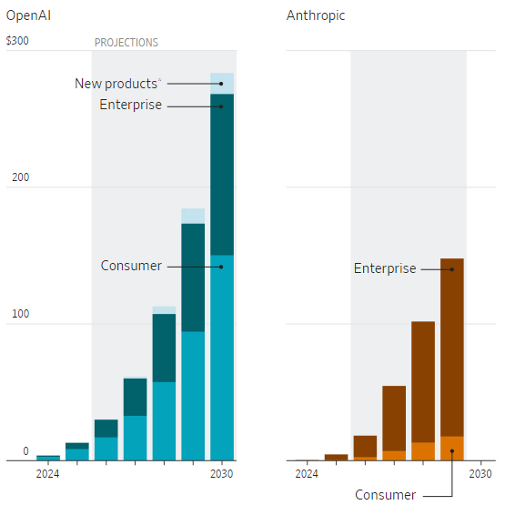 Где-то с 2028 года OpenAI собирается получать выручку не только от ИИ-моделей, но и от реализации прочих продуктов, среди которых будут и аппаратные решения. К концу десятилетия эта часть выручки компании будет измеряться миллиардами долларов, но всё равно основную часть выручки OpenAI будет получать в программном сегменте. Едва ли не $150 млрд выручки в 2030 году ей принесёт потребительский сегмент ИИ, чуть более $100 млрд обеспечит корпоративный сегмент. У Anthropic распределение выручки будет совсем иным, свои $150 млрд в 2030 году она получит главным образом от корпоративных клиентов, а потребительский сектор обеспечит не более $20 млрд выручки.