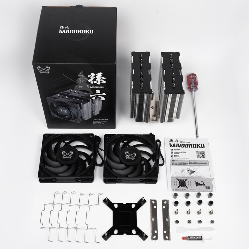Размеры Scythe Magoroku составляют 155 × 142.5 × 134 мм, вес — 1,036 кг. В его состав входят шесть никелированных теплопроводных трубок диаметром 6 мм.