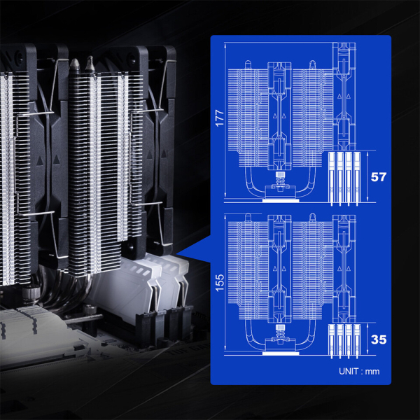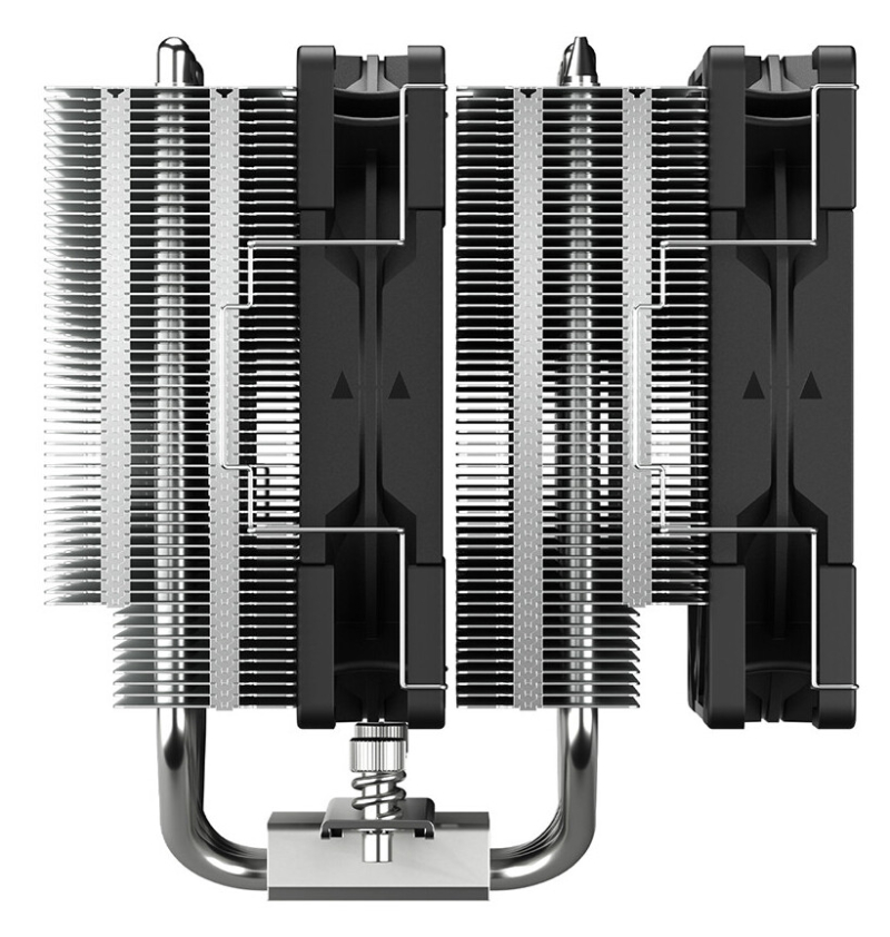 Комплект поставки кулера включает два 120-мм PWM-вентилятора, работающих со скоростью от 350 до 2000 об/мин, создающих воздушный поток до 60,29 CFM, статическое давление до 2,45 мм вод.ст. и обладающих уровнем шума до 26,88 дБА. Каждый вентилятор оснащён антивибрационными прокладками.